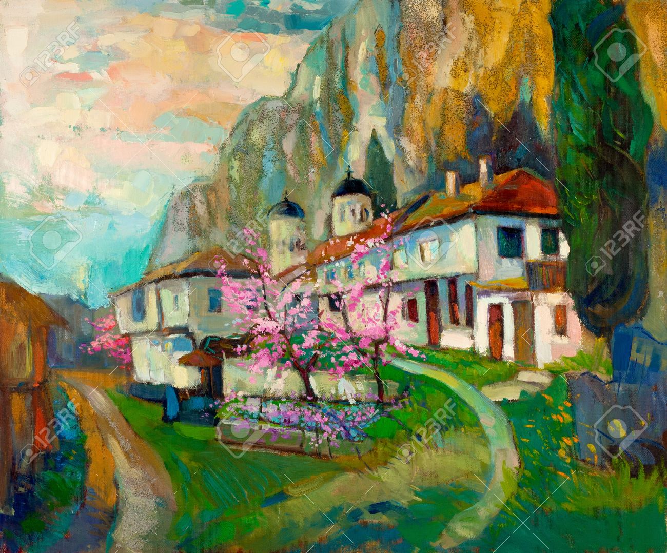 Pintura Al óleo Original De Las Antiguas Casas Tradicionales Búlgaros Y La Iglesia En La Montaña En Canvas.Modern Impresionismo Fotos, Retratos, Imágenes Y Fotografía De Archivo Libres De Derecho. Image 15209774.